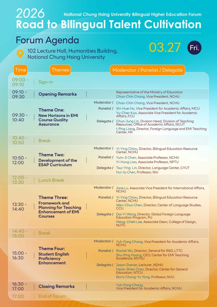 一、為落實2030雙語政策,本校自113年起執行「國立中興大學EMI 教學資源中心計畫」,以深化雙語師資專業發展及雙語教育資源共享,並辦理旨揭論壇活動,期透過交流與對話,提升雙語教學之質與量。