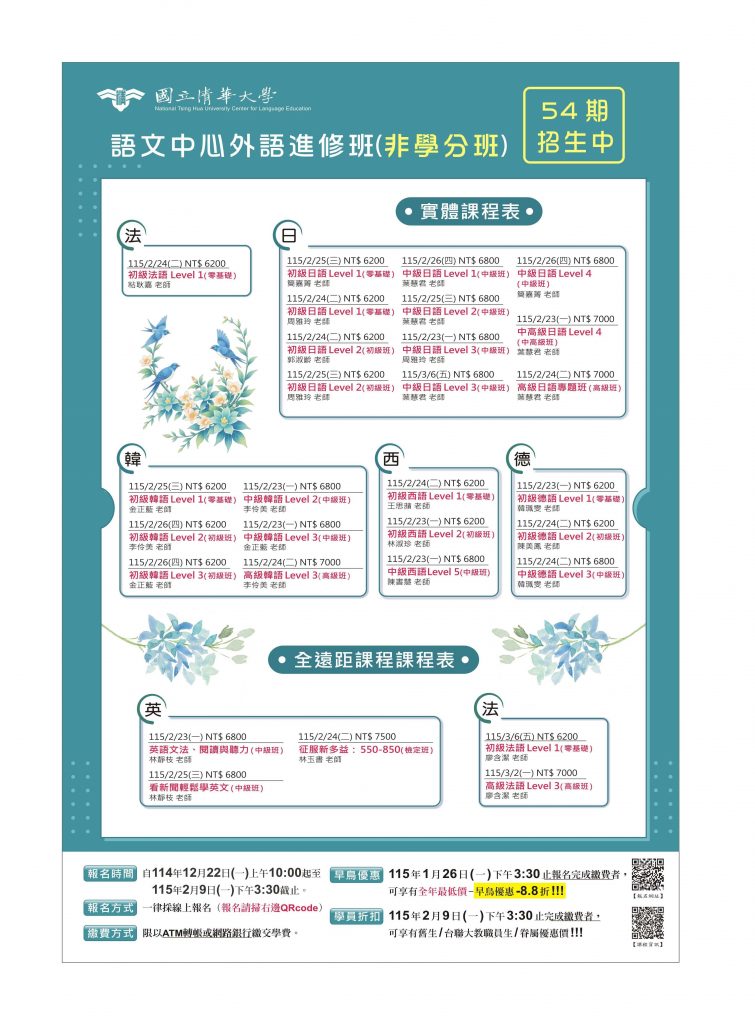 一、為嘉惠民眾終身學習並落實大學社會責任,本校語文中心為培育國際溝通力,辦理各類語文課程。54期外語推廣課程內容包涵英、日、韓、法、德、西等六種語言,各類課程資訊請詳見:https://language.site.nthu.edu.tw/p/412-1212-22652.php?Lang=zh-tw。