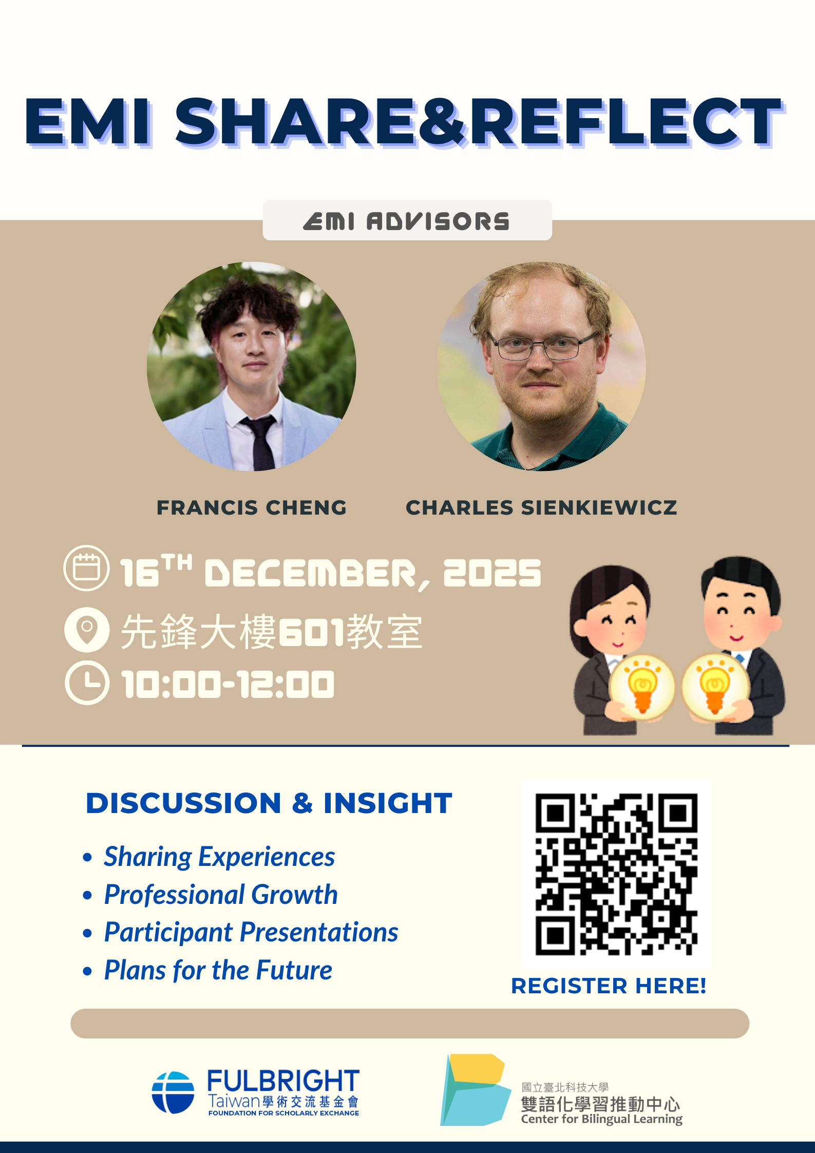一、旨揭工作坊為本校雙語中心與Fulbright Taiwan學術交流基金會協同規劃之活動,透過美籍專業教學顧問辦理EMI教學增能工作坊,協助教師提升全英語授課之專業知能,持續發展EMI課程之實務成效。