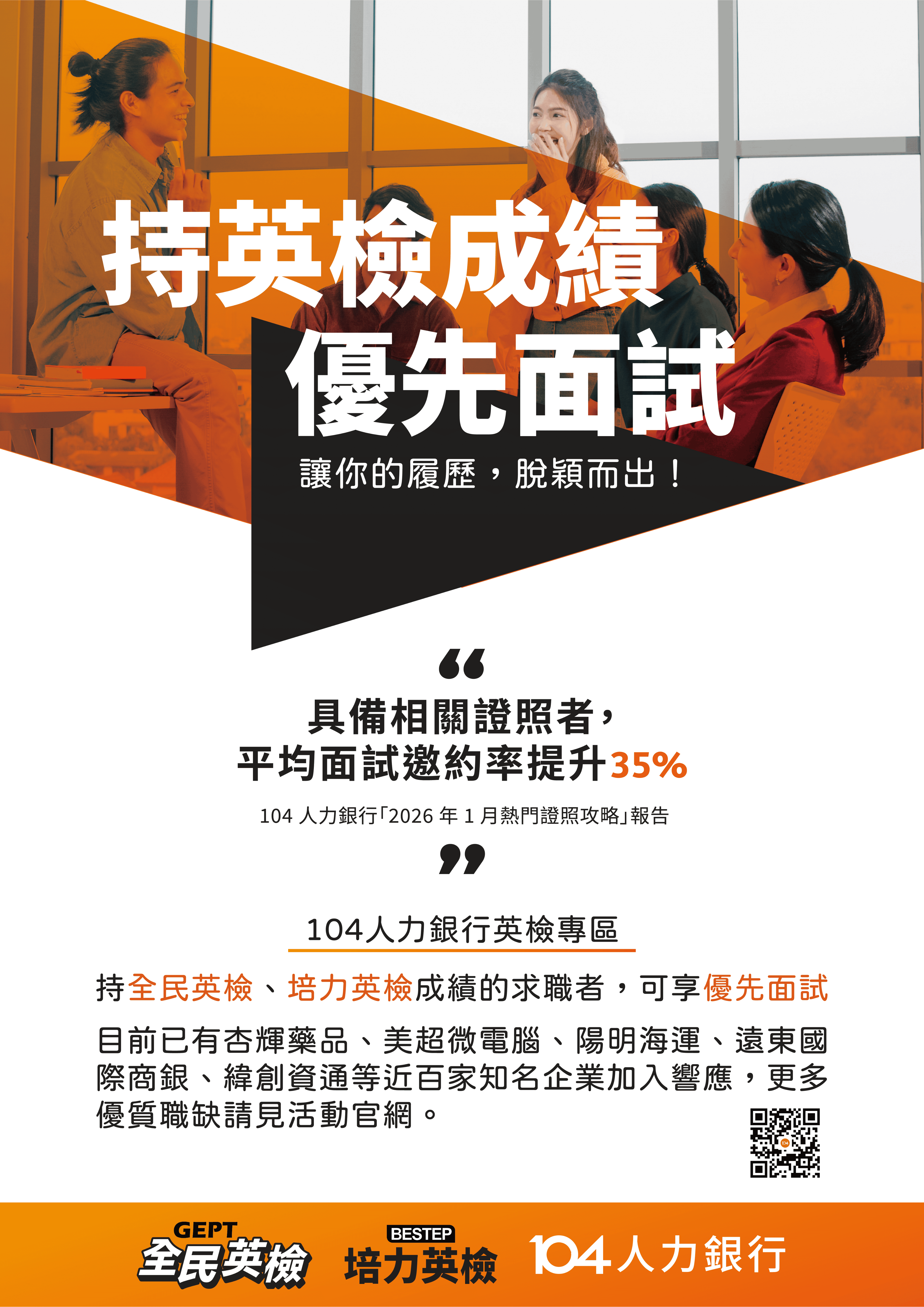 說 明: 一、LTTC與104人力銀行合作,持「全民英檢」成績證書者獲近百家知名企業優先面試機會。詳情請查詢關鍵字「104英檢專區」(https://bit.ly/3PRNaXo)。 二、「全民英檢」成績對照歐洲語言共同參考架構CEFR A2~C1,廣獲國考、公民營機構企業採認。學生可提前規劃,取得英檢成績為開啟職場掌握先機。 三、各級測驗日期敬請參閱「全民英檢年度測驗日程」(https://www.gept.org.tw/GEPT1/gepttestdate.aspx)。
