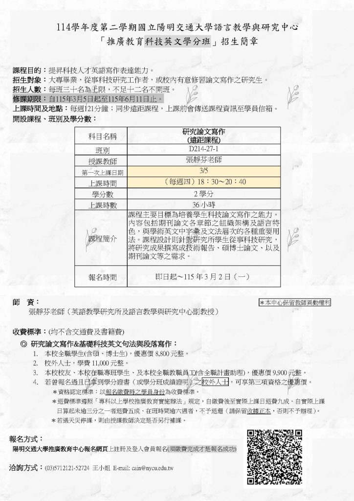 說 明: 一、為提升全國大專校院學生之英語寫作能力,本校語言教學與研究中心於114學年第二學期開設科技英文學分班(遠距課程),歡迎各校學生或社會人士踴躍報名。 二、報名時間:即日起至115年3月2日(星期一)23點59分止。 三、網頁公告:https://cec.nycu.edu.tw/Course/CourseInfo?CId=92960。 四、招生簡章如附件。 五、課程負責人:王秀勻助理,聯絡電話:(03)5712121分機52724,聯絡信箱:cain@nycu.edu.tw。