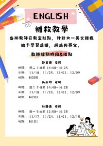 英語補救教學安排教師在教室駐點,針對大一英文課程給予學習建議與解惑等事宜。 | 無須預約 | 詳情請見海報 | ![]() |