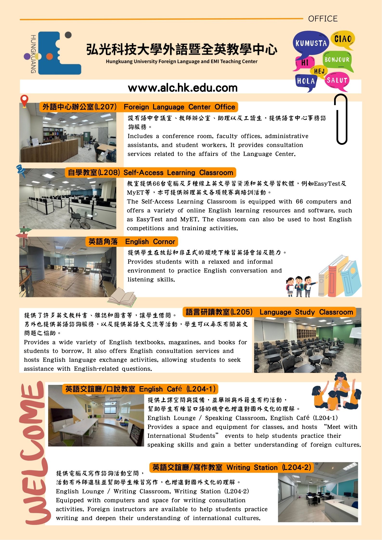 設有語中會議室、教師辦公室、助理以及工讀生,提供語言中心事務諮詢服務。